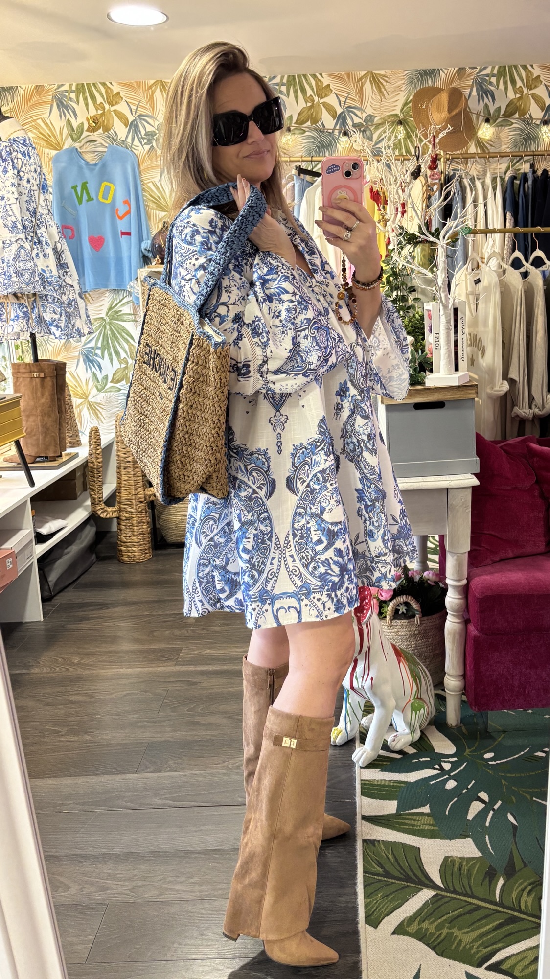 Robe courte fluide à l’imprimé bleu et blanc d’inspiration bohème. Sa coupe ample et ses manches évasées apportent légèreté et mouvement, tandis que le décolleté en V souligne délicatement la silhouette. Une pièce confortable et élégante, parfaite pour un look chic décontracté.