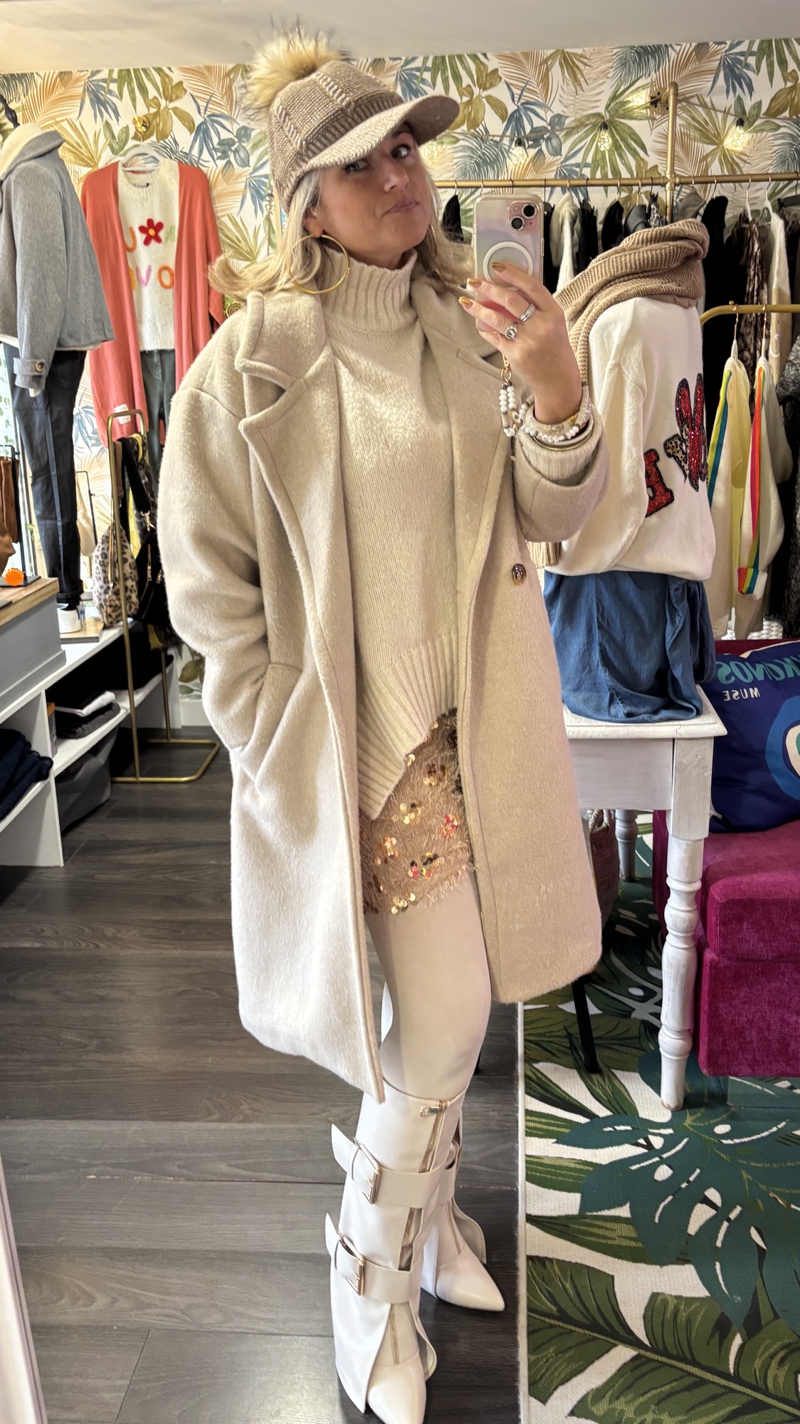 Un manteau long ton sur ton vient structurer l’ensemble avec grâce, tandis que la casquette tricotée à pompon et les grandes boucles dorées ajoutent une touche mode affirmée. Les bottes hautes à larges boucles, résolument stylées, finalisent le look avec caractère.