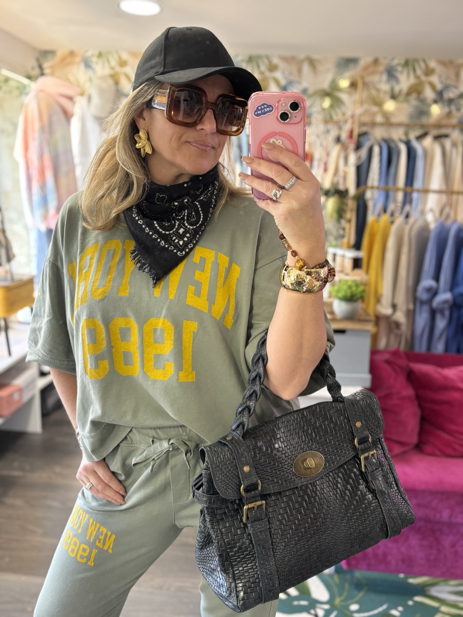 Casquette noire pour l’allure urbaine, lunettes XXL écaille très glamour, boucles d’oreilles dorées statement pour la touche féminine. Sneakers noires et blanches plateforme qui modernisent la silhouette. Le sac noir tressé à boucle dorée ajoute une note chic et structurée qui contraste parfaitement avec le côté casual du look.